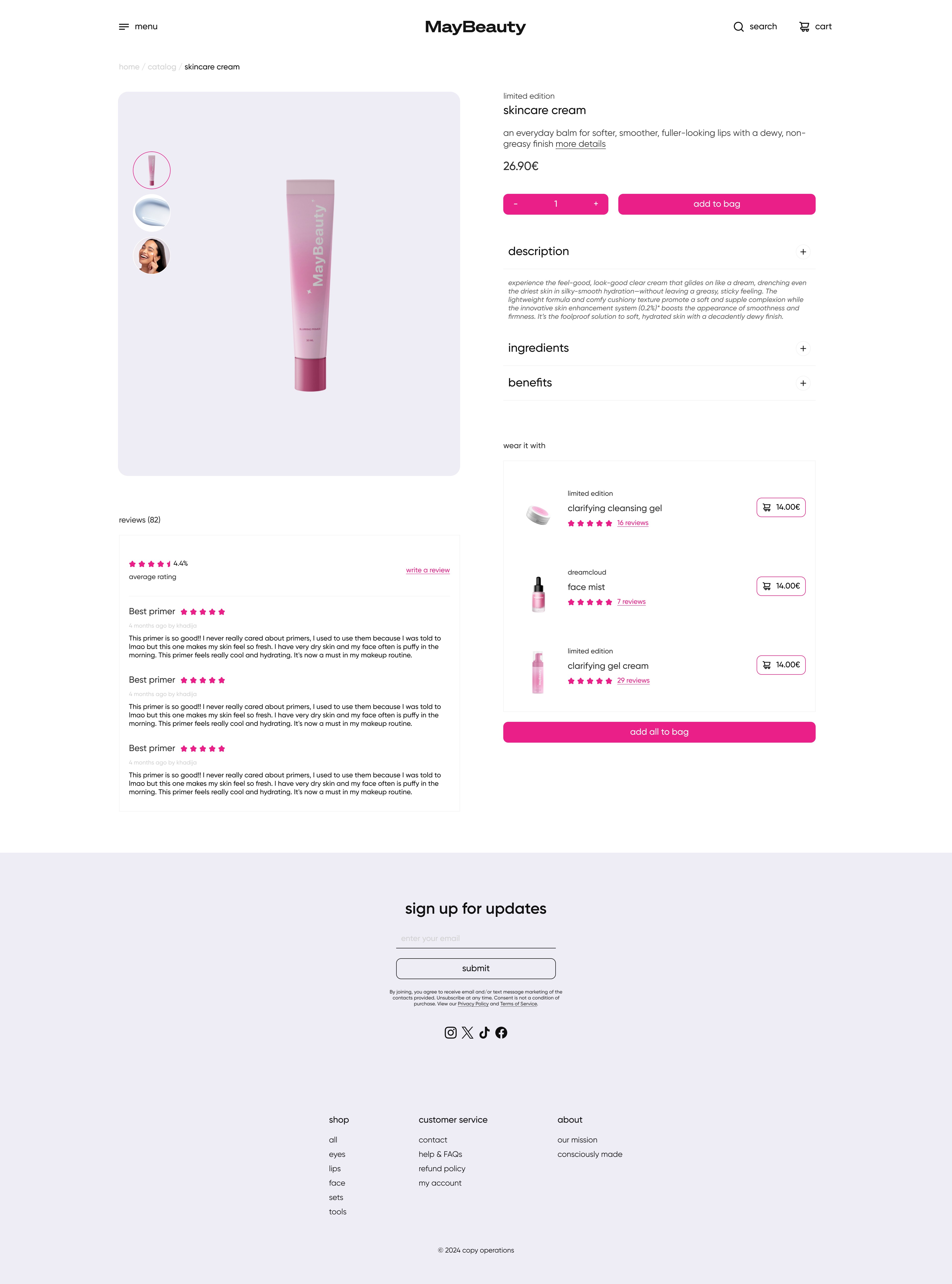 On the product page, I balanced imagery and product details to highlight benefits and key features without overwhelming the user. The layout includes helpful sections such as “Wear it with” recommendations, customer reviews, ingredient lists, and detailed descriptions, making it easy for users to explore, compare, and make confident purchasing decisions.