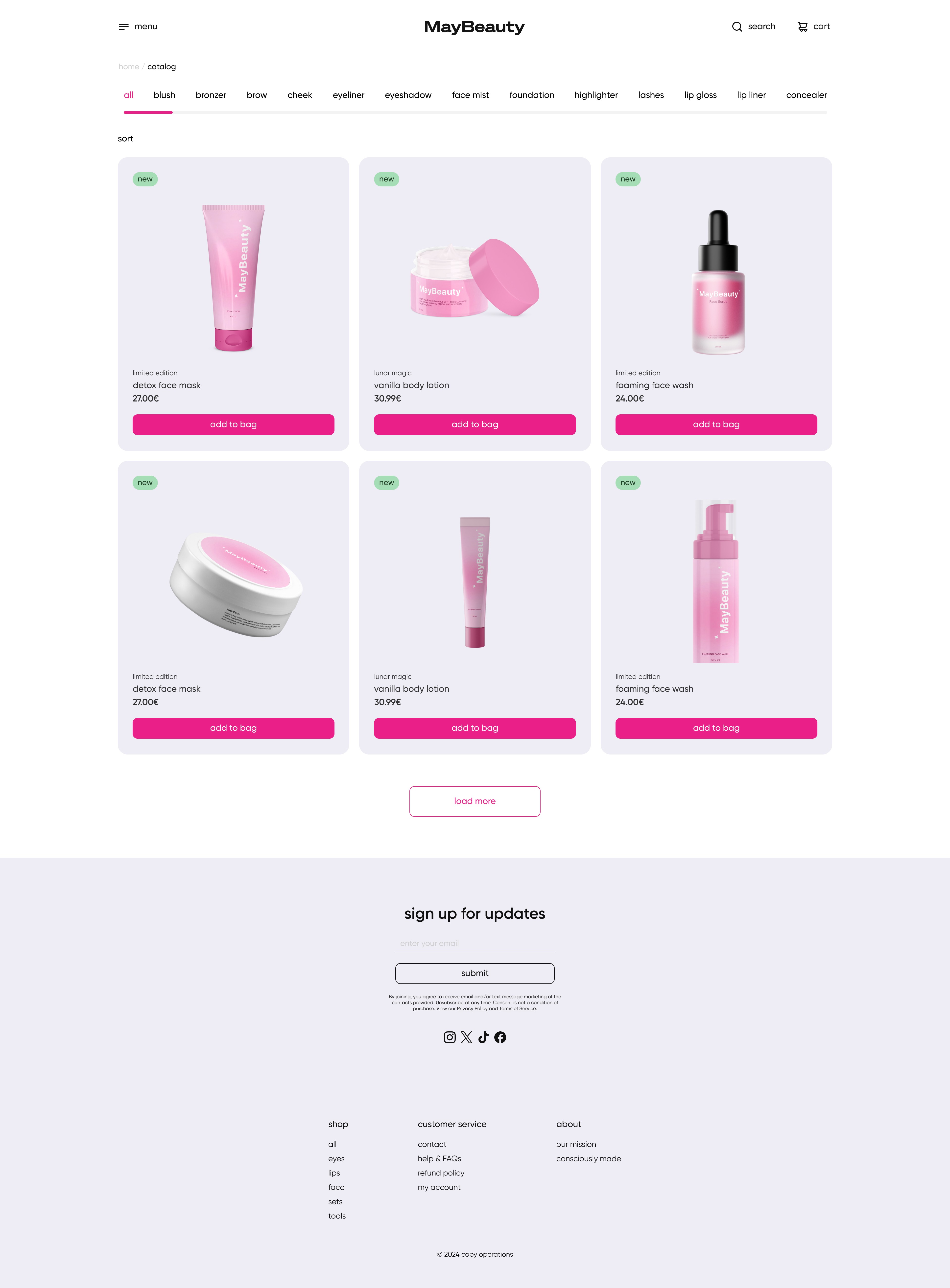 Design a beauty e-commerce experience that: • highlights product values such as cruelty-free, vegan, and recyclable • presents products clearly and consistently • feels calm, clean, and visually soft • supports easy browsing and confident purchasing • balances aesthetics with usability The interface needed to feel trustworthy and warm, without visual overload or aggressive sales patterns.