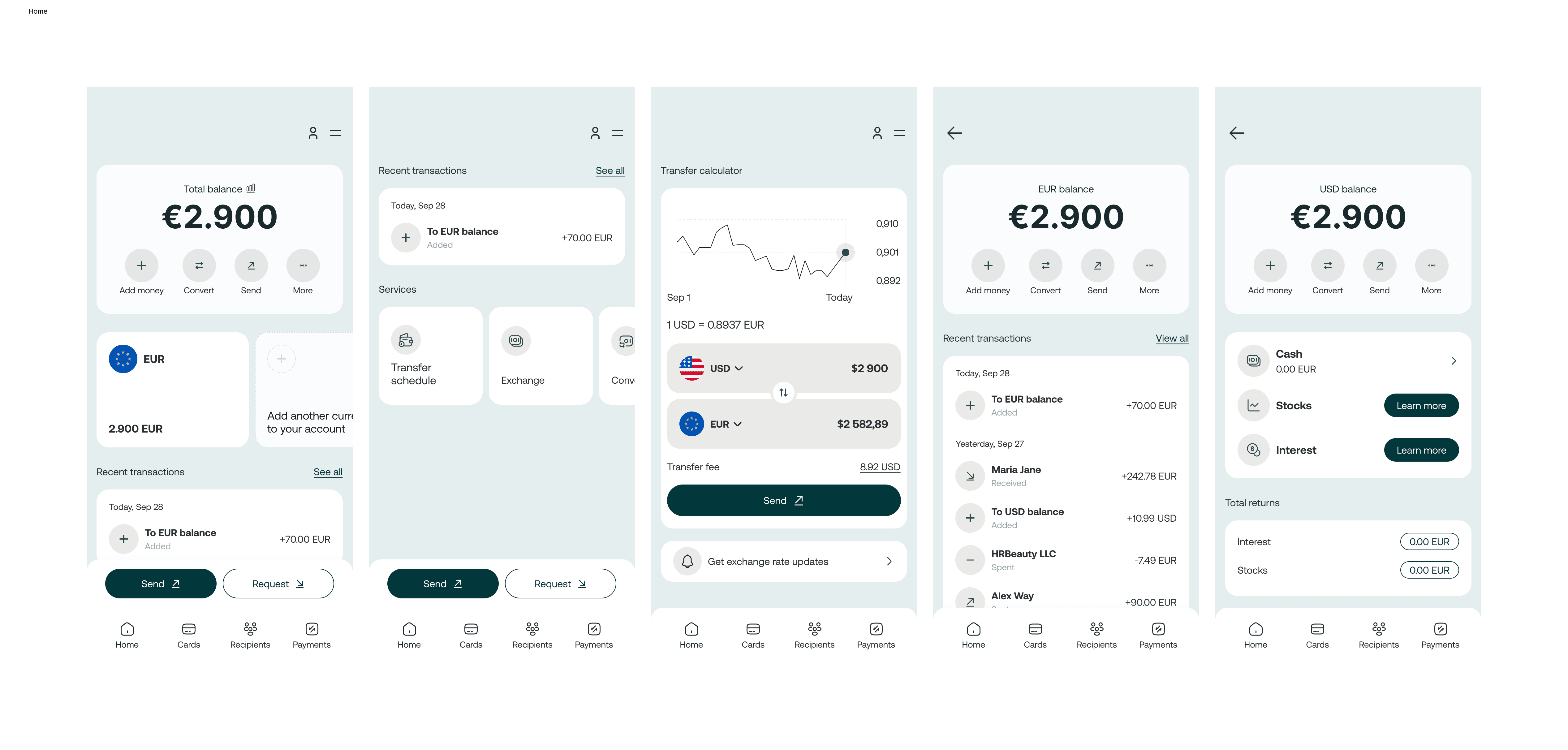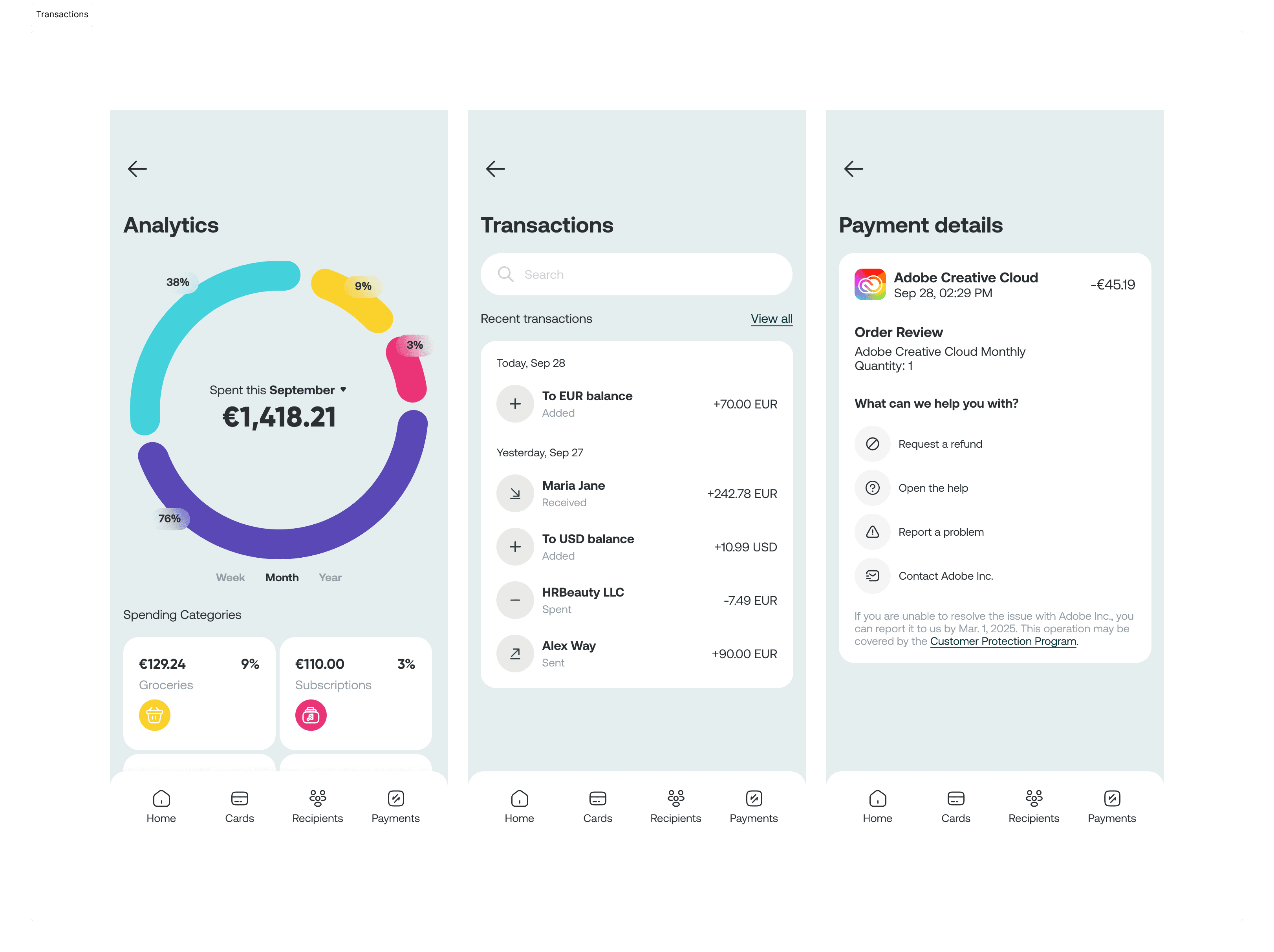 The design focuses on clarity, structure, and visual balance. A clean layout and strong hierarchy help users instantly understand the most important information, such as income, balance, and recent transactions. Key actions are placed prominently and remain easy to access without competing for attention. Typography was chosen to ensure high readability, especially for numbers and financial data. Clear letterforms and consistent spacing help reduce cognitive load and make scanning information effortless. The color palette combines light backgrounds with soft accent tones to highlight key values and actions. Accents are used sparingly to guide attention, while neutral surfaces keep the interface calm and focused. Rounded elements and smooth UI components soften the overall experience, making financial interactions feel less rigid and more human. The interface supports confident decision-making without unnecessary complexity.